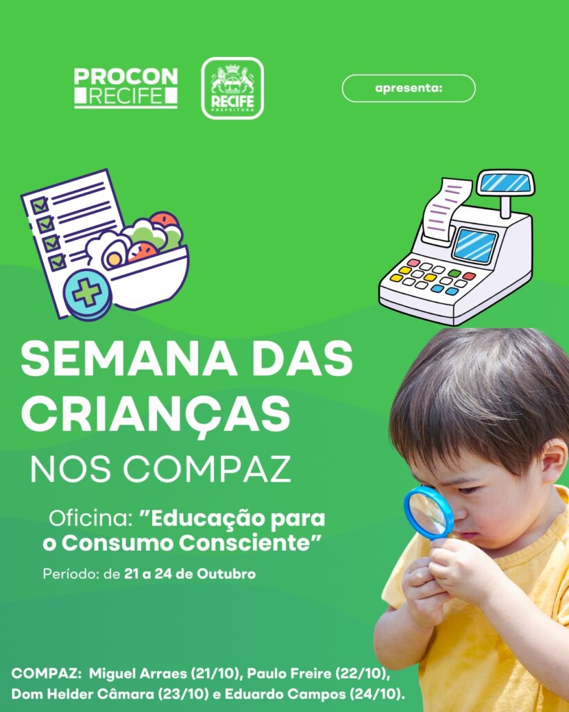 O PROCON Recife realiza, entre os dias 21 e 24 de outubro, a Semana das Crianças nos equipamentos Compaz da cidade, oferecendo uma programação educativa e lúdica voltada para o público infantil e seus responsáveis. A iniciativa traz a oficina “Educação para o Consumo Consciente”, que busca promover reflexões sobre hábitos de consumo, sustentabilidade e economia familiar de forma interativa.